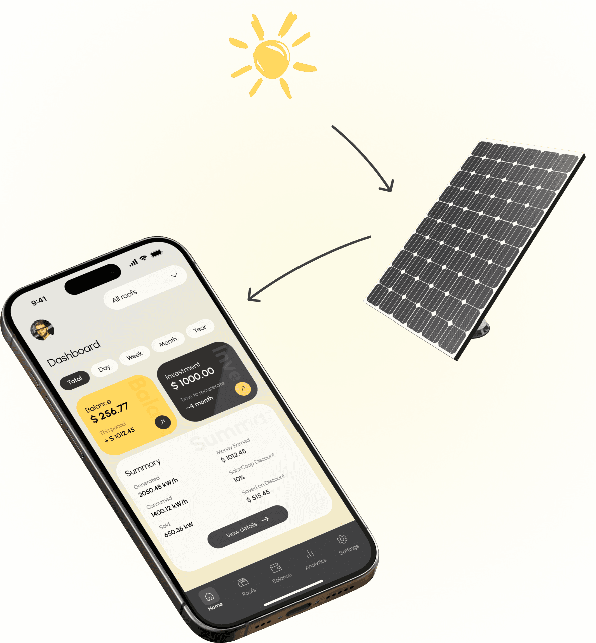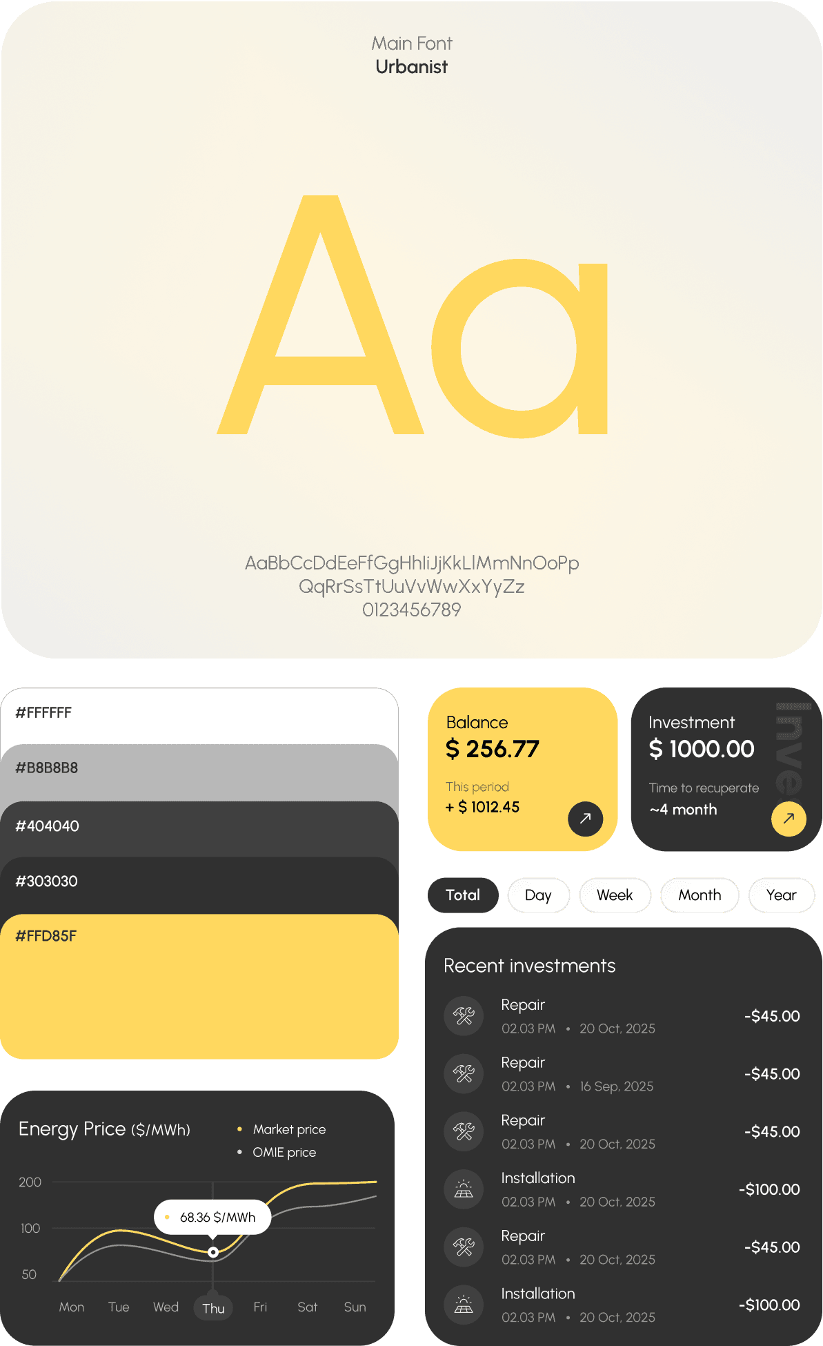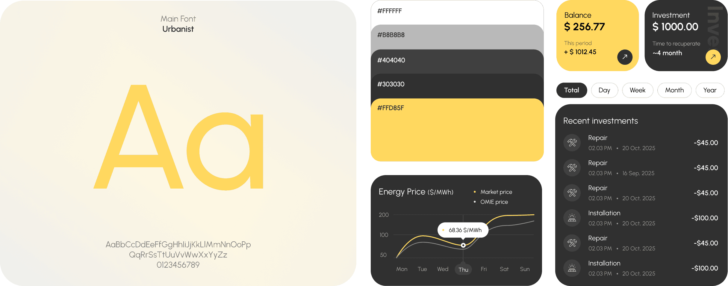 Color palette Neutral backgrounds with subtle gradients, accented by solar yellow for key actions and highlights
