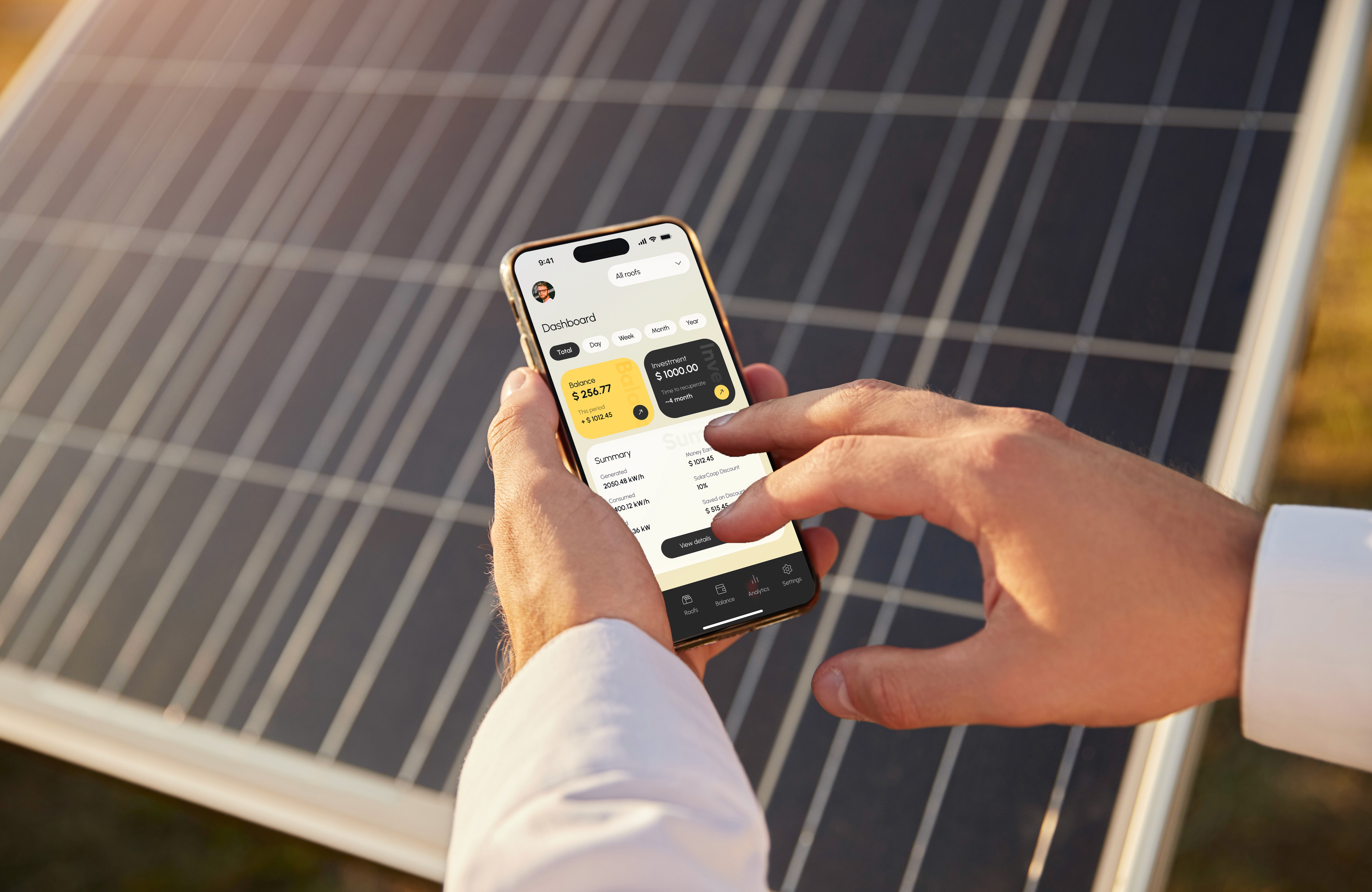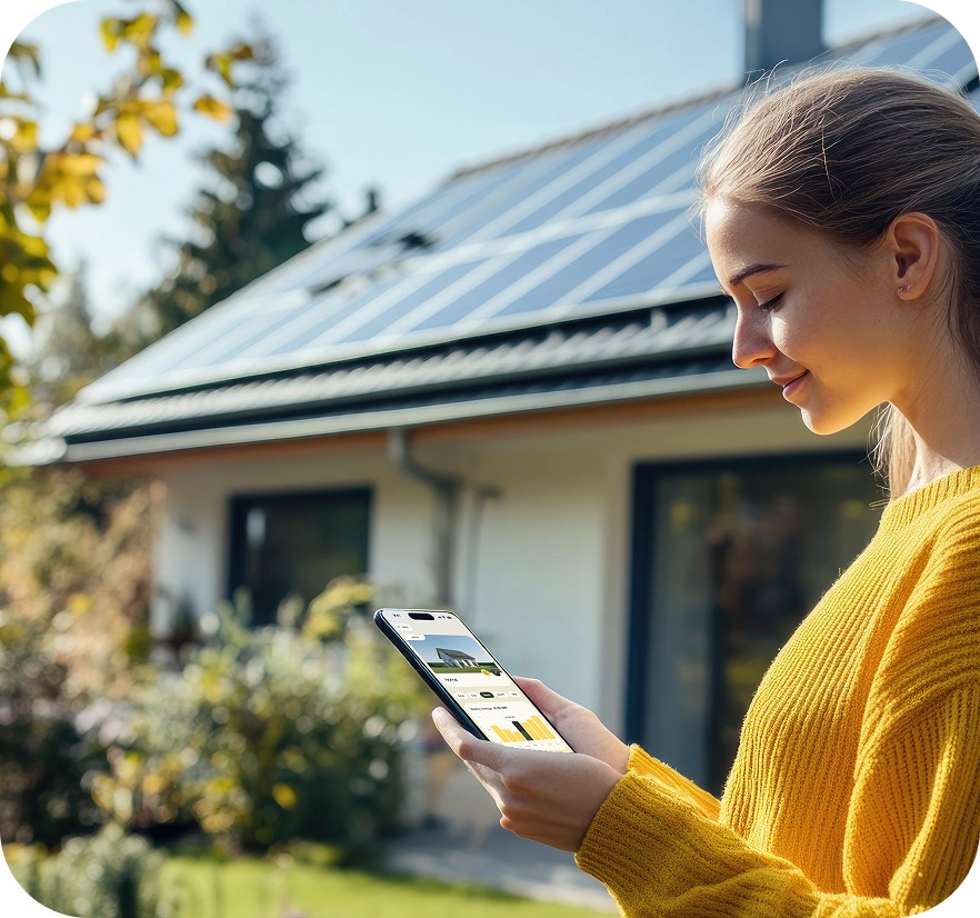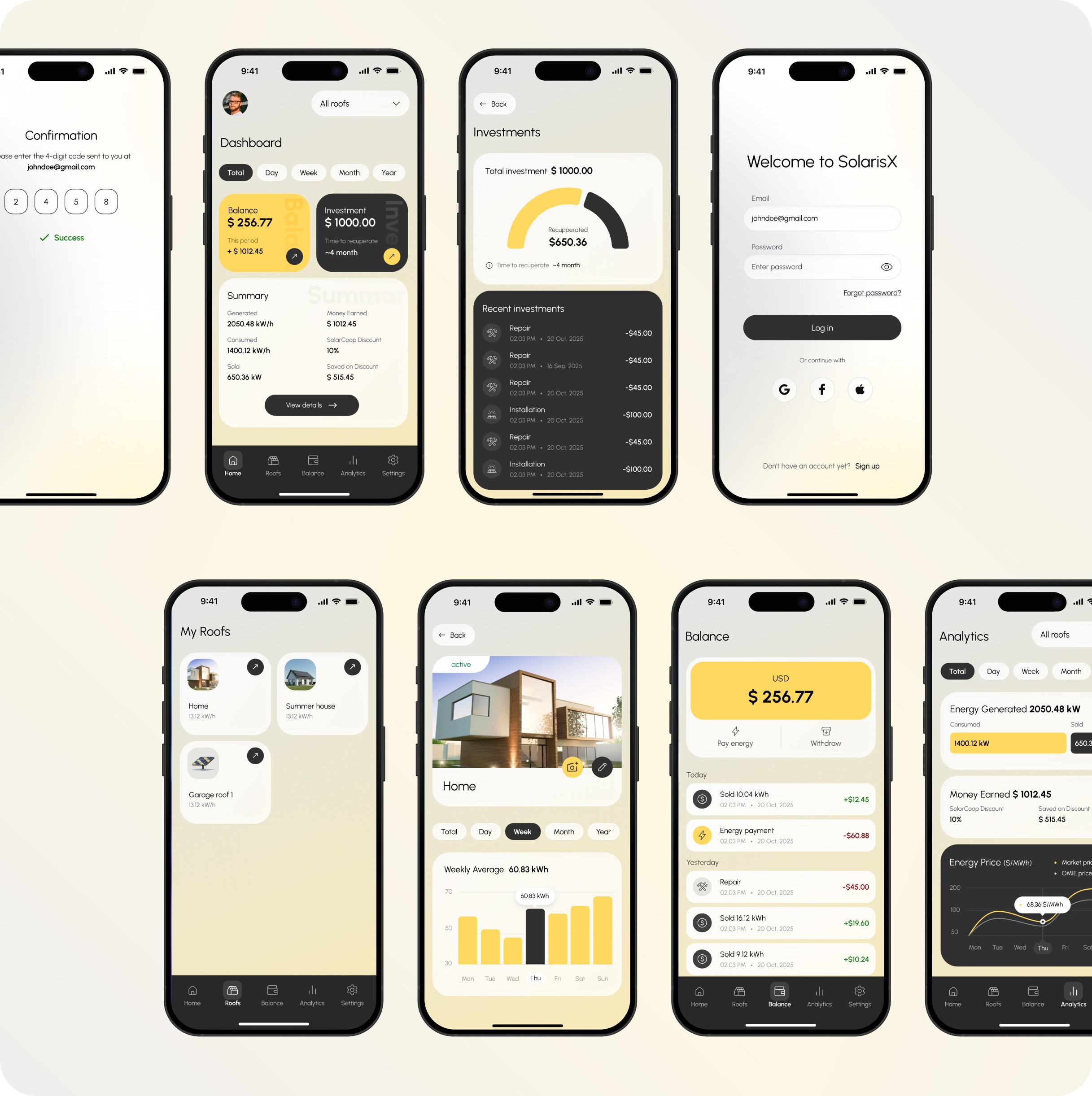 Color palette Neutral backgrounds with subtle gradients, accented by solar yellow for key actions and highlights