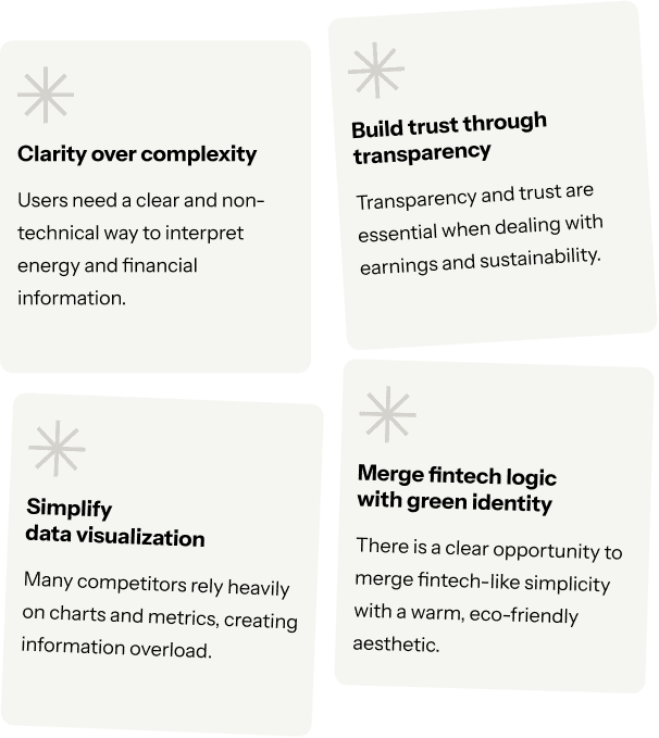 To achieve that, I conducted stakeholder interviews to clarify the product vision and priorities, and performed competitive benchmarking to explore how existing apps communicate energy and financial data.