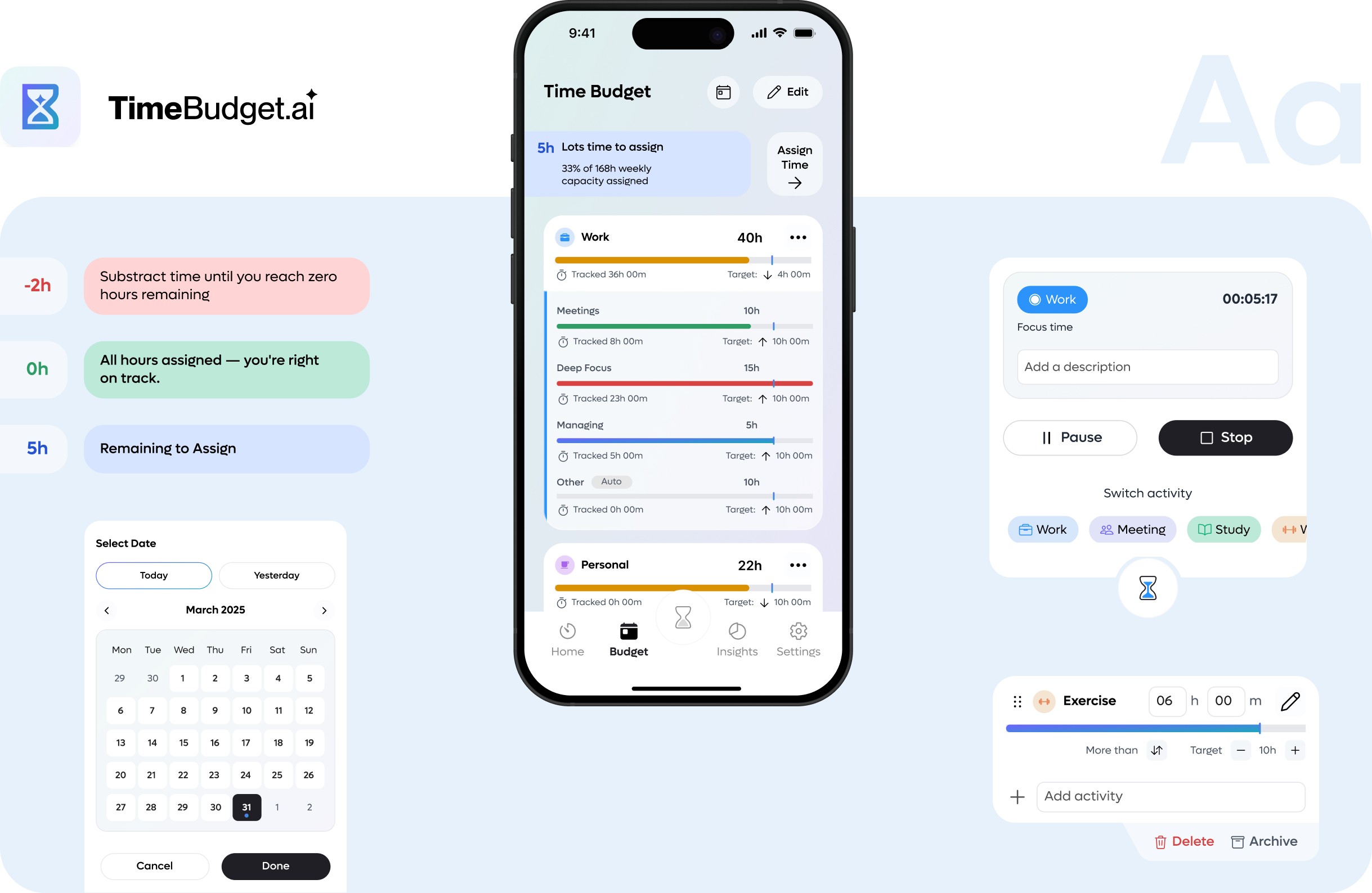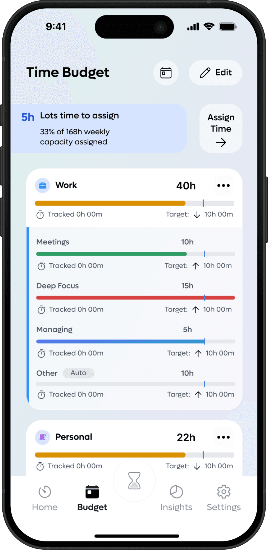 Inspired by YNAB’s “envelope” method — users allocate weekly hours (e.g., 40h) across categories and subcategories.