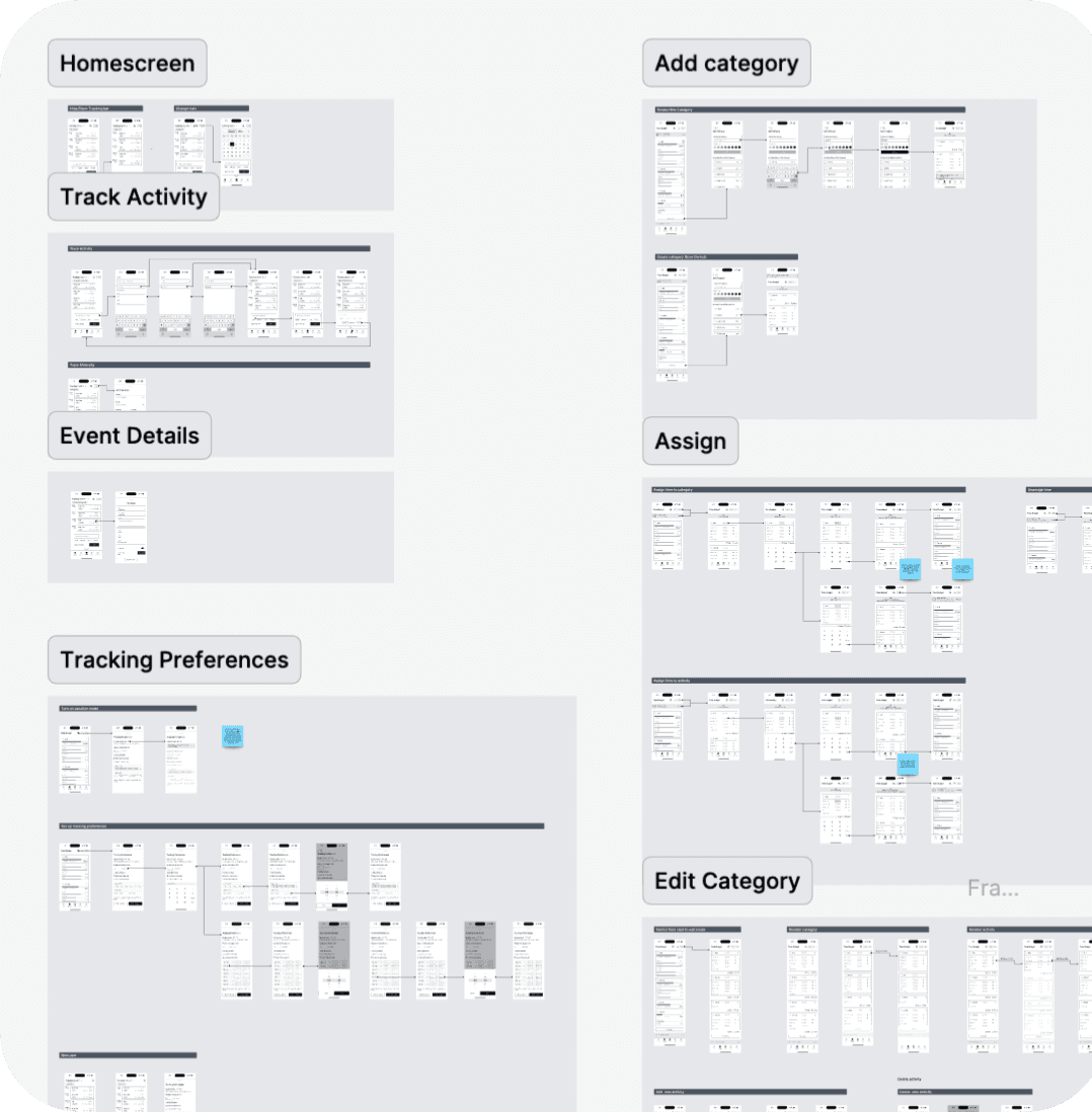 Building on the defined MVP structure, the product logic was translated into a clear and engaging user experience. The focus was on how each function fits into the overall flow and how users naturally move between time tracking, time allocation, and smaller supporting actions like managing categories.